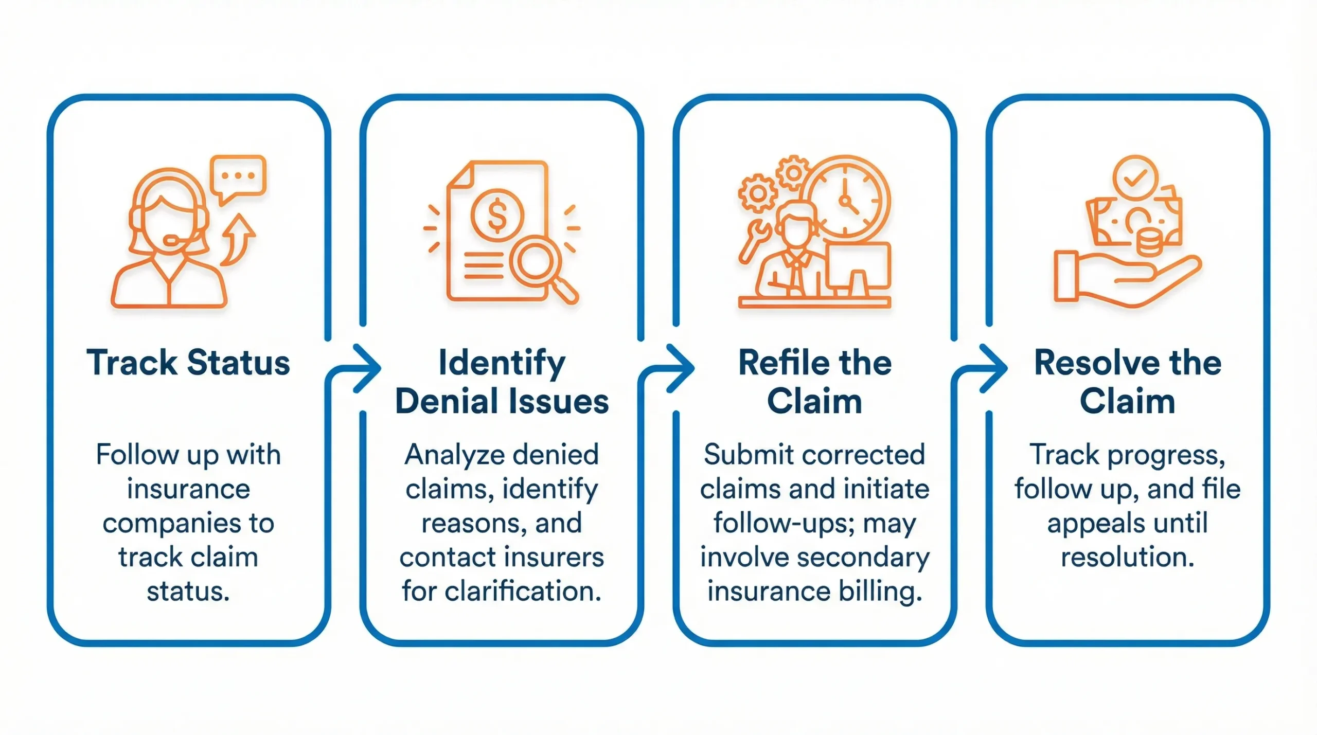 Denied and rejected claims can significantly impact your revenue cycle if not managed efficiently. Studies show that a large percentage of denied claims are never reworked, leading to permanent revenue loss. Our expert team ensures every claim is reviewed, corrected, and resubmitted promptly to maximize reimbursements.